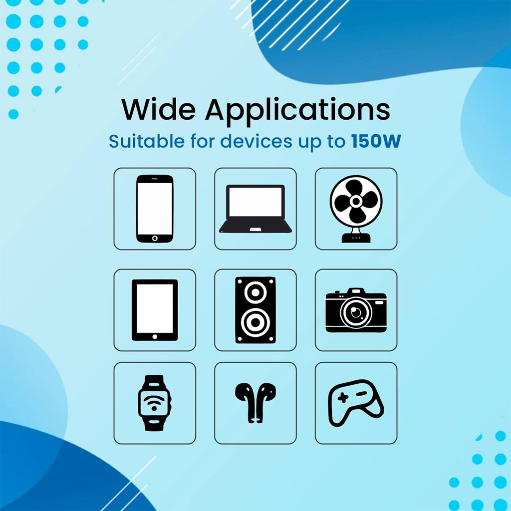 🔌 قدرة ثابتة: يزود أجهزتك بطاقة آمنة ومستقرة حتى 150 واط.