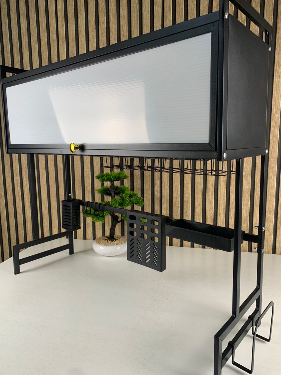 مصمم خصيصًا ليُركّب فوق الحوض، مما يساعد على استغلال مساحة المطبخ بأقصى قدر ممكن. يحتوي على سلة تخزين، حامل سكاكين، حامل لوح تقطيع، حامل أدوات المائدة، و6 خطافات، ليمنحك سطح عمل نظيفًا ومنظمًا وخاليًا من الفوضى.