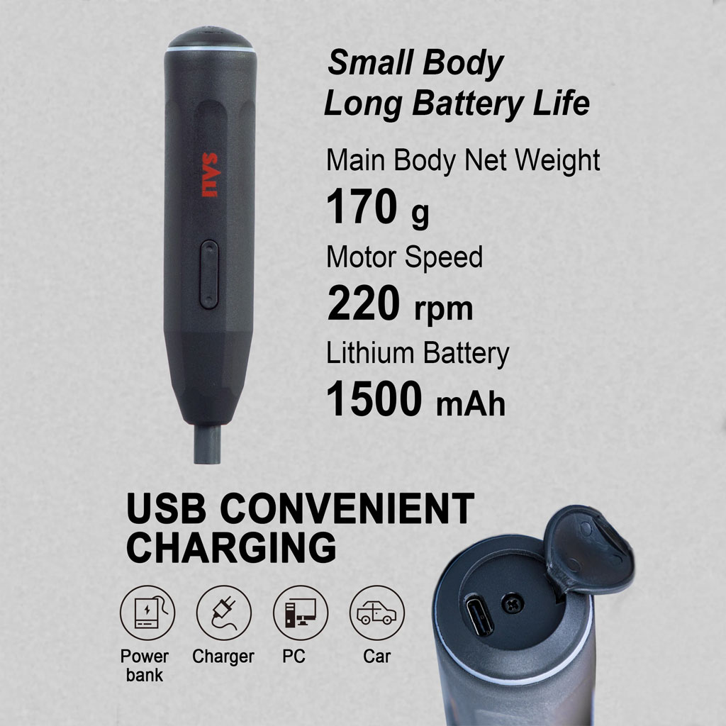 عدة مفكات دقيقة لاسلكية من SALI، مثالية للهواة والمحترفين، ببطارية قابلة لإعادة الشحن وتصميم مدمج يُسهل الاستخدام في المهام الدقيقة.